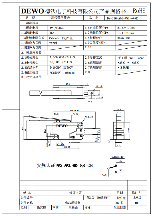 DV-16-A01-NZ2-200E-W型微動開關