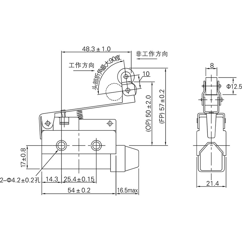 安裝孔間距為25.4mm,與RZ型微動開關相同。
