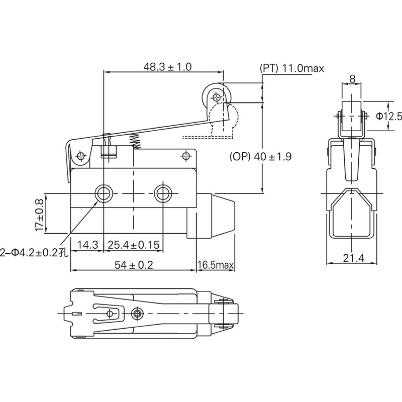 安裝孔間距為25.4mm,與RZ型微動開關相同。
