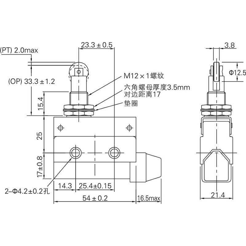 安裝孔間距為25.4mm,與RZ型微動開關相同。
